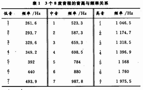 分析表1可見,表中3個不同音程相同音名(同一行)的信號頻率都相差一倍。