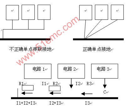 可見串聯(lián)接地容易引起干擾。對于模擬電路,具有工作與低頻狀態(tài)、靈敏度高的特點,采用單點接地(即接地路線與單獨一個參考點相連,圖6給出了正確與錯誤單點接地方式對照)可防止來自其它噪聲元件(如數(shù)字邏輯器件、電源、繼電器、電動機)的大接地電流爭用敏感的模擬地線。同時系統(tǒng)采用光耦將數(shù)字地與模擬地隔離,抑制地點平擺動帶來的影響;采用鐵氧體墊片來防止寄生電容形成接地環(huán)路。在實際設(shè)計中應(yīng)注意采用多點接地時的諧振問題,在每個電源與接地之間的地連接中應(yīng)使用高質(zhì)量的去耦電容。