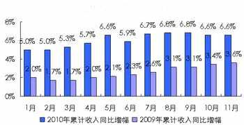 圖1 2010年1~11月通信業收入累計增幅 ——移動電話用戶增長再創新高,固定電話拆機放緩