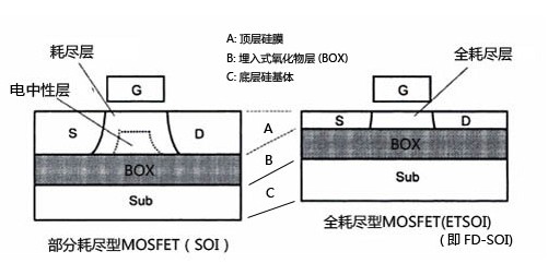 體硅CMOS技術走到22nm之后,特征尺寸已很難繼續微縮,急需革新技術來維持進一步發展。在候選技術之中,FDSOI(Fully Depleted SOI,全耗盡SOI)技術極具競爭力。對于FDSOI晶體管,硅薄膜自然地限定了源漏結深,同時也限定了源漏結耗盡區,從而可改善DIBL(Drain Induced Barrier Lowering,漏致勢壘降低)等短溝道效應,改善器件的亞閾特性,降低電路的靜態功耗。此外,FDSOI晶體管無需溝道摻雜,可以避免RDF(Random Dopants FluctuatiON,隨機摻雜漲落)等效應,從而保持穩定的閾值電壓,同時還可以避免因摻雜而引起的遷移率退化。
