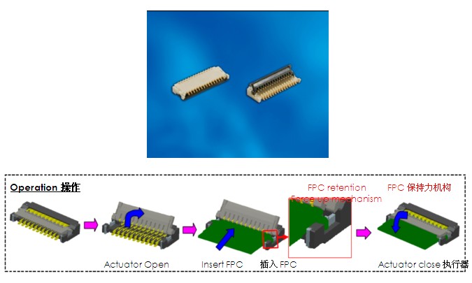 FCI提供的0.5毫米間距, 0.7毫米高度FPC 零插入力連接器可在高度極低的空間內(nèi)提供可靠的連接。它是原SVL系列(0.5毫米間距和0.9毫米高度 ZIF)的升級版,而SVL系列已經(jīng)被廣泛地認(rèn)為是零插入力連接器的標(biāo)準(zhǔn),用于顯示背光燈和可觸摸屏式連接。該VLP0.7毫米高度系列具有相同的帶電纜鎖定功能及底部連接型式的后向觸發(fā)執(zhí)行器。
