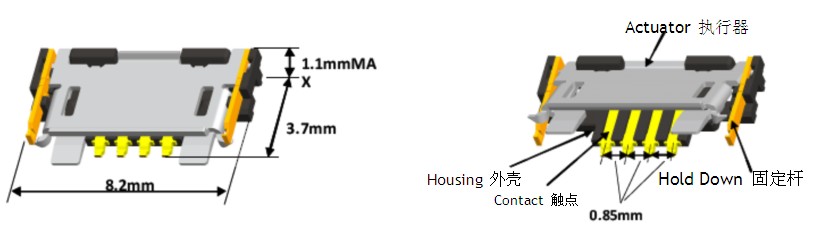 該連接器為0.2毫米(錯位排列)連接間距,帶有0.4毫米導(dǎo)向位。目前可提供11針和29針,計劃最多達(dá)81針。連接器高度為0.9+/-毫米。其外殼材料為熱塑塑料(UL 94V-0), 固定調(diào)整片和連接器的銅合金無鹵素。作為底部接觸型產(chǎn)品,因此可最為廣泛地適用于掀蓋式執(zhí)行器,很方便進(jìn)行關(guān)門操作。就連接器規(guī)格而言,連接器可通過帶有外殼開槽結(jié)構(gòu)的耳式電纜分割結(jié)構(gòu)提供電纜預(yù)持功能。要求的電纜厚度是:0.2毫米+/-0.03