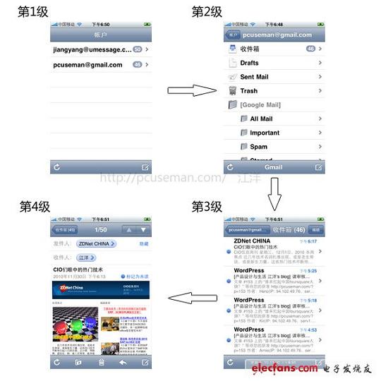 ②對(duì)確認(rèn)的功能結(jié)構(gòu)考慮在iPhone上的信息架構(gòu)模型。上文說(shuō)過(guò),iPhone應(yīng)用是線性的連貫操作,一層一層進(jìn)入直到完成最后的任務(wù),所以你要按這個(gè)思路去整理信息架構(gòu),一般來(lái)說(shuō),操作的深度不要超過(guò)3層,如果超過(guò)3層就要對(duì)產(chǎn)品形態(tài)進(jìn)行扁平化處理,即由深度改為廣度,因?yàn)殡S著深度的增加,每一級(jí)別都會(huì)有不同的功能,甚至有承載上一級(jí)的功能或邏輯,深度越多,這些功能就會(huì)越復(fù)雜,而在手機(jī)如此小的空間上就很難進(jìn)行合理組織。
