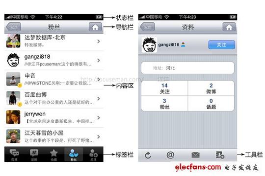 首先iPhone只有一個(gè)物理按鍵Home,而這個(gè)按鈕主要是在系統(tǒng)級(jí)操作上起到一些作用,在一個(gè)應(yīng)用中,絕大多數(shù)情況都是退出功能。在480x320這個(gè)對(duì)手機(jī)而言很大的屏幕上要包括以下3個(gè)模塊,才能對(duì)一個(gè)App進(jìn)行操作。