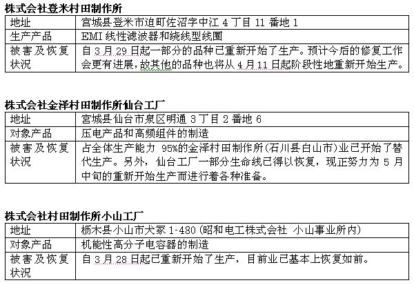 村田株式會(huì)社關(guān)于三個(gè)受災(zāi)工廠的恢復(fù)情況