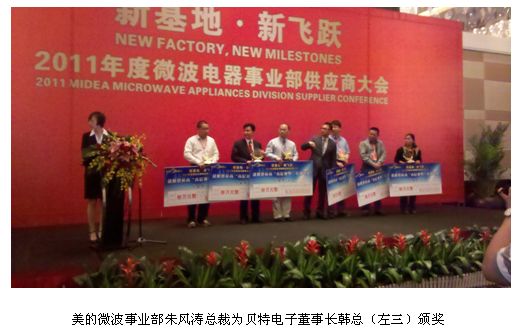 2011年4月14日(星期四),貝特電子科技有限公司應邀出席廣東美的集團舉行的2011年度微波電器事業(yè)供應商大會和新基地落成典禮,在此次盛會中,來自海內(nèi)外的供應商和客戶參加了此次為期兩天的盛會,期間美的將從其900多家供應商中選出20名最佳供應商授予新年度“戰(zhàn)略供應商”大獎。新基地也進一步印證了美的的”5年再造一個美的”的宏偉戰(zhàn)略,這對我們?nèi)w供應商均是一個再上臺階的機會。