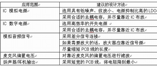 在便攜式音頻系統(tǒng)中,主電源通常是電池。由于系統(tǒng)其它部分(包括無線收發(fā)器、存儲器和顯示器等)造成的瞬態(tài)變化,使得電池的噪聲非常大。因此在給音頻編解碼器或DAC以及其它音頻信號路徑上的器件(如放大器等)提供模擬電源時(shí),最好不要直接使用電池電壓,而是使用具有良好電源抑制比(PSRR)和低輸出噪聲的低壓降穩(wěn)壓器(LDO)。這樣可確保模擬電路有‘潔凈’的工作電源。需要仔細(xì)選擇LDO,確保其額定電流能足以滿足所供電電路的需求。在模擬電源端去耦電容的使用方法也很重要。大的去耦電容(10µF 以上)非常適合電源濾波。數(shù)值較小的去耦電容(1µF以下)在提供IC所需的快速瞬變電流時(shí)也是必需的。去耦電容必須盡可能靠近模擬電源引腳放置,并在電容和電源與地的連接中盡可能避免出現(xiàn)PCB過孔。相對于比較大的電容來說,較小的去耦電容要更靠近IC引腳擺放,因?yàn)榇?lián)電阻對較小電容的響應(yīng)時(shí)間影響較為顯著。
