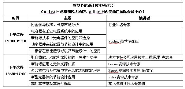 [page]新型節(jié)能設計技術研討會以風能太陽能發(fā)電與節(jié)能設計為主題,圍繞智能電源、逆變器設計、智能控制、馬達控制、新型電子元器件與模塊的應用展開探討,來自知名廠商的技術專家將分享逆變器設計、馬達控制、變頻技術、電力電子技術在風能/太陽能、工業(yè)電子、通信設備、軍工上的應用解決方案和節(jié)能設計技術。
