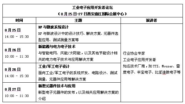 作為2011西部電子論壇中的一個新環(huán)節(jié),論壇組委會將聯(lián)合2011中國(西安)電子展,同期展會2號館推出工業(yè)電子應用開發(fā)者論壇,該活動是2011中國(西安)電子展中的核心活動之一,聚焦以西安為中心的電子行業(yè)最為關注的RF微波、新能源以及工業(yè)應用等主題,邀請研發(fā)一線的工程師與領先的技術廠商代表同臺展示設計新技術、新思路、新方案,為工業(yè)電子應用開發(fā)者提供深入、平等交流的機會。
