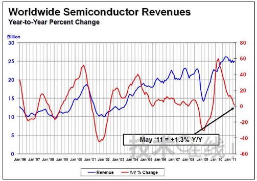 - 2011年5月全球半導體銷售額僅增長1.8% 出現停滯和衰退