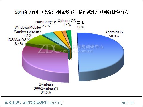 (圖) 2011年7月中國智能手機市場品牌關(guān)注比例分布[page]