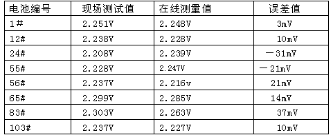 根據(jù)規(guī)程的要求,日常測(cè)量蓄電池端電壓采用是高精度4位半的數(shù)字萬(wàn)用表,一般高精度萬(wàn)用表蓄電池直流電壓檔測(cè)量精度為0.7%以上,絕大多數(shù)蓄電池在線裝置產(chǎn)品說明書上提到的測(cè)量精度達(dá)到了0.5%以上;顯示測(cè)量數(shù)值有些蓄電池在線裝置的測(cè)量端電壓數(shù)值為小數(shù)點(diǎn)后2位,與規(guī)程要求有較大誤差;有些裝置測(cè)量值雖可以到小數(shù)點(diǎn)后3位,但與實(shí)際用表測(cè)量數(shù)值相差較大。從運(yùn)行情況看,端電壓在線監(jiān)測(cè)的誤差是隨機(jī),每個(gè)數(shù)值偏差都不一致,而且偏差值隨著環(huán)境溫度、浮充電壓變化等而變化。表1為現(xiàn)場(chǎng)任意抽查幾個(gè)蓄電池浮充電壓,現(xiàn)場(chǎng)測(cè)試值與在線測(cè)量值的誤差情況,現(xiàn)場(chǎng)測(cè)試采用FLUK111數(shù)值萬(wàn)用表直流檔測(cè)量精度0.7%,在線測(cè)量為許繼電源公司的WXJ-16型巡檢儀,測(cè)試環(huán)境溫度25℃。