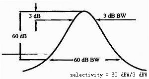 中頻濾波器的頻率選擇性是中頻濾波器的60 dB帶寬與3 dB帶寬之比,如圖3所示。它反映了頻譜儀分辨不等幅信號的能力,對于幅度相差60 dB的2個信號,其間隔至少是60 dB帶寬的一半,才可以分辨出2個信號,否則小信號可能被淹沒在大信號的裙邊中。用數字化技術實現的窄帶帶通濾波器頻率選擇性可達到5:1,模擬濾波器頻率選擇性可達到15:1或11:1。圖3為濾波器的頻率選擇性示意圖。