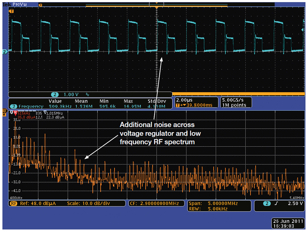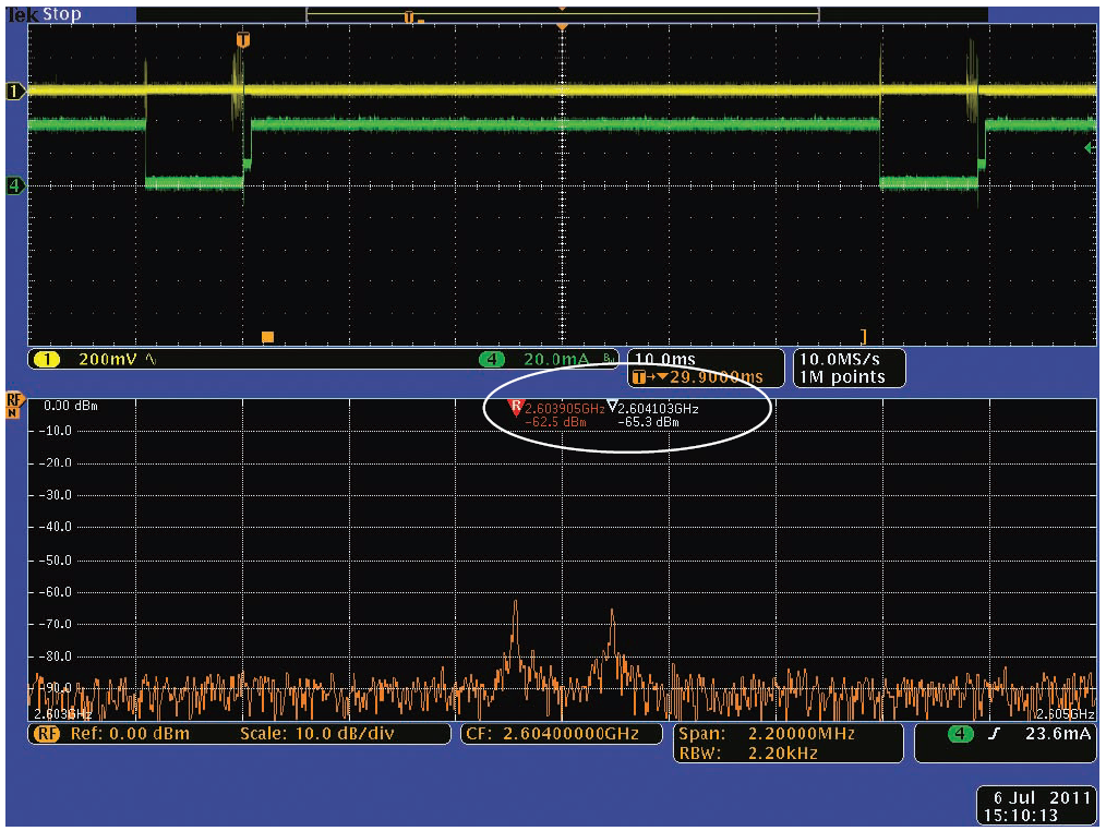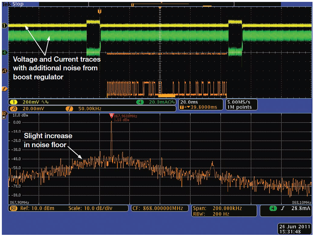 上圖是在使用干凈的實驗室電源供電的模塊中獲得的,這在實際環(huán)境中很難實現(xiàn),但可以作用實用參考。圖4顯示了相同的RF信號,但使用升壓型開關電源為無線電模塊供電。升壓穩(wěn)壓器因產(chǎn)生噪聲而臭名昭著,但它允許使用一個或兩個堿性或鎳鎘單元及相對較少的器件,降低了成本。注意被調(diào)制信號底部的噪聲提高。在發(fā)送的信號附近,噪聲至少要比干凈的電源高5 dB。噪聲已經(jīng)容易地顯現(xiàn)在電流波形和電壓波形中。額外的噪聲還會令從發(fā)射機收集這些數(shù)據(jù)所使用的接收機上的信號信噪比劣化,降低無線電系統(tǒng)的有效范圍。