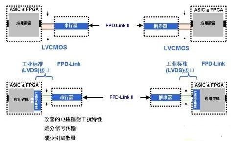 一旦接收器PLL鎖定在發(fā)射器的頻率下,即可由LOCK輸出標(biāo)志引腳顯示這一狀態(tài),確保接收器輸出的數(shù)據(jù)完整性。DS90UR907/8芯片組具有DS90UR905/6芯片組的一切特性,兩耳區(qū)別在于輸入輸出不再是發(fā)送LVCMOS信號(hào)的并行總線,而是遵照開放的工業(yè)標(biāo)準(zhǔn)"FPD-Link"。很多現(xiàn)代化的圖像控制器、顯示定時(shí)控制器、ASIC和FPGA都支持這種"一級(jí)串行化"技術(shù),它采用適合18bpp的3個(gè)數(shù)據(jù)通道,或者適合24bpp的4個(gè)數(shù)據(jù)通道,每一個(gè)都有一路并行時(shí)鐘通道。電信號(hào)的發(fā)送遵循開放的ANSI/TIA/EIA-644A標(biāo)準(zhǔn),該標(biāo)準(zhǔn)又稱作"LVDS"(低壓差分信號(hào)傳輸)。使用該接口技術(shù)代替常規(guī)LVCMOS的優(yōu)勢在于:采用差分信號(hào)可降低電磁干擾,并減少組件的引腳數(shù)量,如圖3所示。
