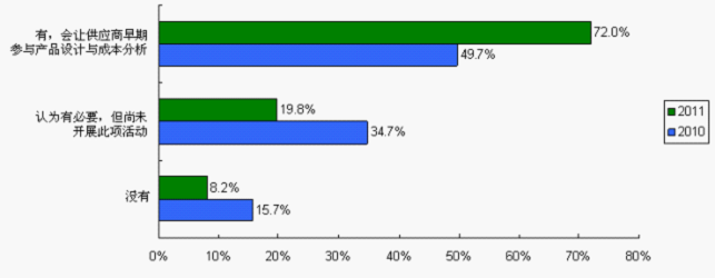 讓供應商參與早期的產品設計是增進供求雙方伙伴關系的途徑之一,借助供應商的技術優勢,挖掘元器件成本空間,從而提高產品競爭力、加快產品上市、降低成本。讓供應商早期參與產品設計與成本分析由2010調查的49.7%大幅上升至2011調查的72%,而其中69.2%是主芯片供應商的參與,30.8%是被動元件供應商的參與。