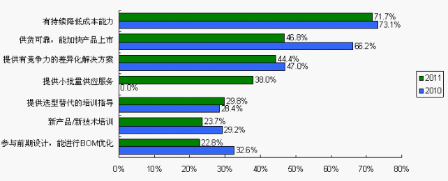 此外,工程師對成本降低持續關注,小批量供應服務成為工程師關注的亮點。隨著市場的企穩,供貨可靠不再變成重大事件。2011中國電子制造商采購行為調查發現,工程師對供貨穩定可靠的期望由2010調查的66.2%大幅降至2011調查的46.8%。