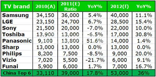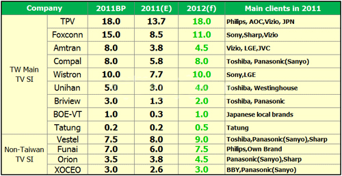 受到品牌需求減少影響,加上部分品牌增加自制比率,臺灣代工廠第三季呈現5.2%之衰退,但經過庫存去化及品牌預拉升年底銷售業績影響,預估第四季將有6-9%之成長力道。但整年度看來,TPV(冠捷)還是坐穩第一名,明年如能順利掌控PHILIPS品牌,2012年度計劃有可能朝20百萬臺邁進;鴻海(Foxconn)和緯創(Wistron)則受到Sony大幅調降電視需求影響,今年目標恐難以達成,明年成長力道也將受到限制;仁寶(Compal)、永碩(Unihan)、景智(Briview)主要客戶群皆以日本品牌Toshiba(主要為歐日訂單)為主,日震和歐洲經濟困頓,也大大影響其年度績效;瑞軒(Amtran)則受到Vizio波及,整體代工量也未能達標。盡管臺灣電視代工廠有Philips、Sony、Toshiba及Vizio等國際品牌及自有品牌的加持,但還是逃不過大環境不佳的沖擊。