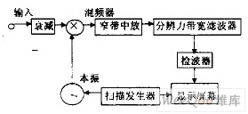 現在所用的頻譜分析儀多為超外差式,并采用多次變頻(3~4次),以降低中頻頻率,實現窄通帶和高分辨力。超外差式頻譜分析儀的基本工作原理如圖 1所示。輸入信號與本振(LO)混頻,產生中頻(IF)信號經窄帶中放被送到包絡檢波器,檢波器輸出信號被放大并使屏幕顯示產生垂直偏轉,掃描發生器保證屏幕顯示的水平頻率軸和本地振蕩器調諧同步,它同時驅動水平偏轉調諧LO。