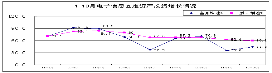 今年1-10月,電子信息產業固定資產投資持續高速增長,500萬元以上項目完成固定資產投資7361億元,同比增長60.1%,增速高于工業投資33.5個百分點。但從9月份開始,投資增速開始回落,9、10月份分別同比增長35.6%和44.4%,增速低于8月份(70.8%)35.2和26.4個百分點,同時10月份完成投資869.5億元,環比下降2.3%。