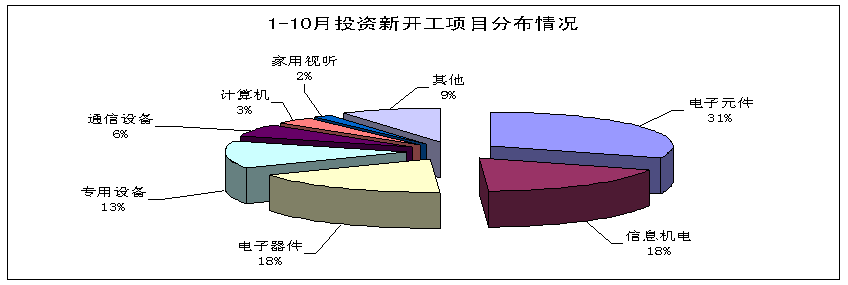 1-10月,在各地大力發展戰略性新興產業的帶動下,電子信息產業固定資產投資保持高速增長,新開工項目明顯增多,基礎元器件領域投資領先增長,行業結構不斷調整。主要特點如下: