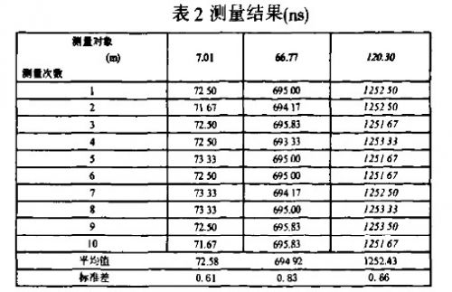 由關(guān)系式(2)可知,對(duì)已知材料的電纜,電纜長(zhǎng)度L與發(fā)射脈沖與反射脈沖間時(shí)間間隔Δt成正比。通過對(duì)已知長(zhǎng)度的電纜發(fā)射脈沖與反射脈沖的時(shí)間間隔進(jìn)行測(cè)量,可以對(duì)時(shí)間間隔測(cè)量模塊的特性進(jìn)行驗(yàn)證。本文對(duì)長(zhǎng)7.01m,66.77m和120.30m的電纜分別進(jìn)行多次測(cè)量,測(cè)量結(jié)果如表2所示。
