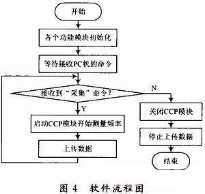 軟件的主要功能就是設置相關的功能模塊來配合硬件實現(xiàn)頻率的采集與數據的上傳,為了達到實時采集的目的,CCP模塊使用中斷方式進行捕捉。測頻儀與PC機采用主從式通信,PIC18F452根據PC機發(fā)來的不同指令進行相關的操作,指令共有兩種:開始采集和停止采集。當接收到“開始采集”命令時,PIC18F452就啟動CCP模塊進行頻率的測量并把測量結果通過串口上傳到PC機;當接收到“停止采集”的命令時,PIC18F452就關閉CCP模塊,同時停止上傳數據,然后繼續(xù)等待上位機的命令。測頻儀的軟件流程圖如圖4所示。