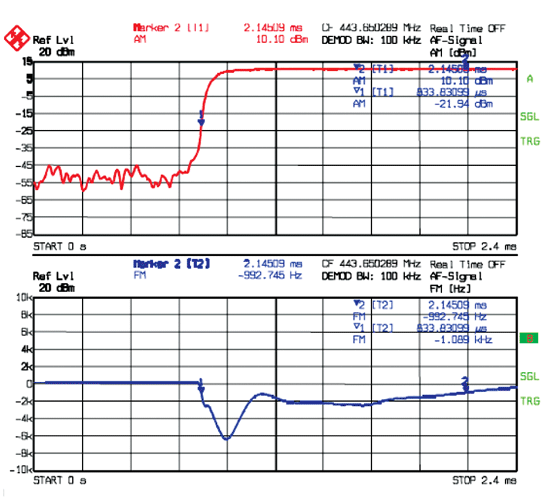 對于發(fā)射機和頻綜源來說,它們的幅度、頻率和相位瞬態(tài)特性是重要的測試指標。一般來說,頻率穩(wěn)定時間是指發(fā)射機在輸出電平達到一定數(shù)值(通常為穩(wěn)定輸出功率-30dB)開始,監(jiān)測FM解調(diào)頻譜,直到頻率穩(wěn)定到設(shè)計限值之內(nèi)的這一段時間。