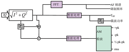 對此數(shù)組進行窄帶低通濾波,獲得載波幅度數(shù)組Vc ,計算AM-DC與Vc的差分數(shù)組,它與Vc的比值A(chǔ)Mdeep 數(shù)組表述調(diào)制深度,對其進行檢波:正峰值 (+pk):數(shù)組中的最大值;負峰值 (+pk):數(shù)組中的最小值;峰-峰值/2 (1/2pk-pk):數(shù)組中的最大值與最小值差值的一半;均方根值 (rms):數(shù)組中數(shù)值的均方根值。