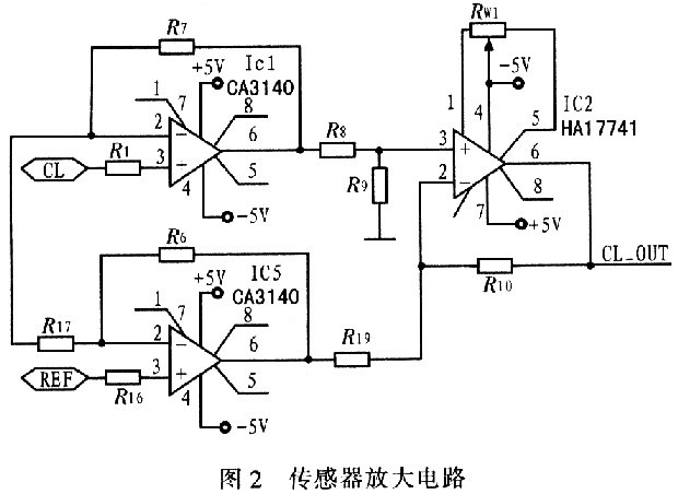 如圖2所示,采用3個(gè)運(yùn)算放大器組成的測量放大電路,前段有2個(gè)高輸入阻抗的CA3140構(gòu)成差動(dòng)輸入。后端的HAl7741實(shí)際上是一差動(dòng)跟隨器,其增益近似為1。為了保證放大器的精度,負(fù)反饋電阻選擇高精度低溫漂的精密電阻,且電路閉環(huán)增益不太大。同時(shí)為防止電路板表面的漏電流,對電路板進(jìn)行了局部鏤空。為了能在野外惡劣環(huán)境下工作,對電路板還進(jìn)行了防潮處理和電子屏蔽。