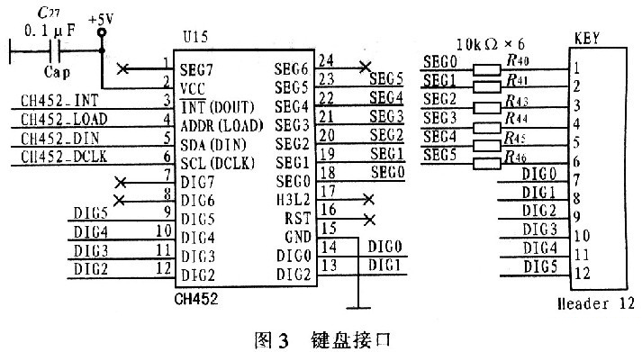 圖3為基于CH452的鍵盤接口電路。為了防止按鍵被按下后,CH452的SEG信號線與DIG信號線形成短路,在CH452的DIG0~DIG5引腳與鍵盤矩陣之間串聯(lián)有限流電阻,圖3中R40~R46,其阻值為10 kΩ。CH452采用4線制與主處理器ATxmegal28A1鏈接,占用主處理器1個(gè)中斷接口和l組SPI接口。