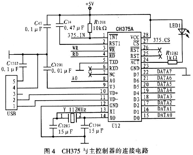 為便于儀器現(xiàn)場使用方便,該系統(tǒng)設(shè)計(jì)了對外信息輸送的USB接口,可使儀器便捷地與各類存儲器及電腦連接。其中,USB接口控制器采用CH357器件。CH357支持USB-HOST主機(jī)方式和USBDEVICE/SLAVE設(shè)備方式。在本地端CH375具有8位數(shù)據(jù)總線和讀、寫、片選控制線以及中斷輸出,可方便地掛接到ATxmegal28Al微控制器的系統(tǒng)總線上。圖4為CH375與主控制器的連接電路,CH375的TXD引腳直接接地,從而使CH375工作于并口方式。電容C1201用于CH375內(nèi)部電源節(jié)點(diǎn)退耦,采用0.01μF的高頻瓷片電容,可提高接口的EMI要求。電容C47和C1202用于外部電源退耦,采用0.1μF的高頻瓷片電容。晶體X11、電容C1203和C1204用于CH375的時(shí)鐘振蕩電路。USB-HOST主機(jī)方式要求時(shí)鐘頻率比較準(zhǔn)確,X11的頻率是12 MHz±0.4‰,C1203和C1204是容量約為15 pF的獨(dú)石電容。LEDl為數(shù)據(jù)傳送指示燈,用戶可以直觀觀察數(shù)據(jù)傳送狀態(tài)。