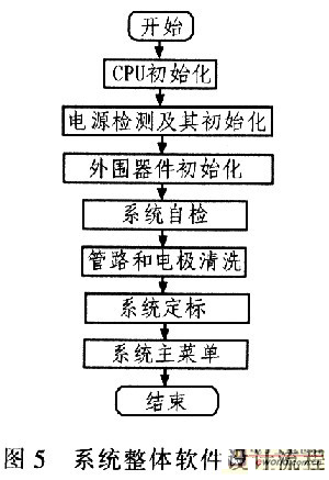 該系統(tǒng)軟件開發(fā)采用ATMEL公司提供的AVRStudio開發(fā)環(huán)境,并在該開發(fā)環(huán)境中內(nèi)嵌了支持C語言的GCC。分析儀軟件全部采用C語言編寫,這樣開發(fā)周期縮短,維護(hù)便捷。該系統(tǒng)軟件設(shè)計(jì)采用層次化模塊化結(jié)構(gòu)設(shè)計(jì),共分為兩個(gè)層次,第l層是按照硬件各個(gè)功能模塊編寫相應(yīng)的驅(qū)動(dòng)和接口程序,包括液晶顯示、打印機(jī)、按鍵處理、步進(jìn)電機(jī)、A/D采集轉(zhuǎn)換、系統(tǒng)時(shí)鐘、檢測和電源管理等模塊;第2層是在第1層的基礎(chǔ)上按照使用功能編寫的應(yīng)用程序模塊,有主菜單、樣本分析、質(zhì)控分析、質(zhì)控統(tǒng)計(jì)、系統(tǒng)設(shè)定、系統(tǒng)校準(zhǔn)、電極清洗、數(shù)據(jù)儲存及查詢和系統(tǒng)自檢等模塊。圖5中給出系統(tǒng)整體軟件設(shè)計(jì)流程。