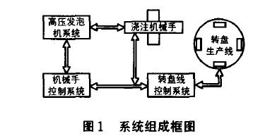 由圖可知,機(jī)械手控制系統(tǒng)是整個(gè)汽車儀表板生產(chǎn)線的核心,它主要完成高精度的定位控制、與上位機(jī)通訊、數(shù)據(jù)采集、故障報(bào)警,以及控制發(fā)泡機(jī)高壓循環(huán)及澆注時(shí)間,接收來(lái)自轉(zhuǎn)盤線的速度信號(hào)以適應(yīng)轉(zhuǎn)盤不同運(yùn)行方式。高壓發(fā)泡機(jī)系統(tǒng)主要完成ISO(異氰酸酯)和POL(聚醚多元醇)2種發(fā)泡料的流量、壓力調(diào)節(jié)及原料循環(huán)控制。轉(zhuǎn)盤控制系統(tǒng)主要完成轉(zhuǎn)盤速度調(diào)節(jié)及模具開合控制。