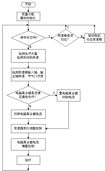 TCU控制系統(tǒng)主程序框圖如圖3所示。程序首先對(duì)內(nèi)部RAM進(jìn)行分配,然后對(duì)各功能模塊如Administrator/D轉(zhuǎn)換器、定時(shí)器、PWM波形發(fā)生器等進(jìn)行初始化。變速箱的變比在汽車每次時(shí)應(yīng)處于最小變比的位置,因此在每次停車時(shí)應(yīng)將變速箱歸位,汽車起動(dòng)后首先檢測(cè)各參數(shù),如檔位開(kāi)關(guān)、發(fā)動(dòng)機(jī)轉(zhuǎn)速、節(jié)氣門(mén)開(kāi)度、變速箱輸入、輸出軸轉(zhuǎn)速等。這些參數(shù)是控制電磁離合器電流和電動(dòng)機(jī)狀態(tài)的依據(jù)。當(dāng)需要增加變速箱的變比時(shí),TCU控制電機(jī)正轉(zhuǎn),反之控制電機(jī)反轉(zhuǎn)。電磁離合器的控制采用電流增量控制方式。它的控制好壞,直接影響汽車運(yùn)行的平穩(wěn)性和經(jīng)濟(jì)性。