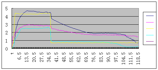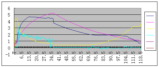 圖5為汽車速度從零加到120KM/H后又由120KM/H減到零時(shí),位置傳感器與輸入軸轉(zhuǎn)速、輸出軸轉(zhuǎn)速和電機(jī)電壓之間的關(guān)系曲線。由圖可知,當(dāng)汽車速度在從零加到120KM/H過(guò)程中,位置傳感器變比由最大開(kāi)始下調(diào)直到變?yōu)樽钚。藭r(shí)對(duì)應(yīng)電機(jī)反轉(zhuǎn)。當(dāng)車速由120KM/H開(kāi)始下降時(shí)位置傳感器先保持不變,此時(shí)電機(jī)不轉(zhuǎn),同時(shí)輸入軸轉(zhuǎn)速和輸出轉(zhuǎn)速成比例的下降,當(dāng)車速達(dá)到一定的值時(shí)位置傳感器速比由最小開(kāi)始上調(diào)直到為最大值,此時(shí)電機(jī)反轉(zhuǎn)(因測(cè)試時(shí)采用的電流傳感器為單方向的,所以圖中沒(méi)有反映出反向電流)。輸入軸轉(zhuǎn)速和輸出軸轉(zhuǎn)速不成比例的下降直至為零。從圖5可以看到車速在上升時(shí),位置傳感器速比的測(cè)試值不斷地減小(對(duì)應(yīng)的轉(zhuǎn)速比增大)。反之,車速在下降的過(guò)程中,當(dāng)車速小于某一值時(shí)測(cè)試值增加。從而實(shí)現(xiàn)了變速箱變比的自動(dòng)調(diào)整。
