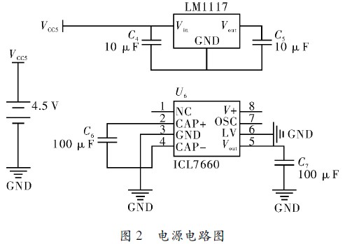 Intersil公司生產的ICL7660是提供雙電壓的COMS集成芯片,它在提供正負電壓方面有獨特的優勢。ICL7660可以提供+1.5~+10 V和-1.5~-10 V的正負電壓。ICL7660正輸出電壓Vout+和負輸出電壓分別接入INA126電源的正負極。電源模塊的電路原理如圖2所示。