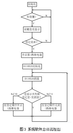 系統(tǒng)軟件總體流程圖如圖3所示。系統(tǒng)上電后,首先進(jìn)行初始化,對寄存器和I/O端口進(jìn)行設(shè)置。當(dāng)檢測到按鍵有效信號,讀取按鍵數(shù)據(jù),傳遞給單片機(jī)并送顯示模塊顯示,鍵盤設(shè)定結(jié)束后置標(biāo)志位,單片機(jī)檢測到此信號后,開啟第1路繼電器進(jìn)行加熱。此時初始化數(shù)字溫度計DS18B20進(jìn)行溫度測量,并將測得實時溫度數(shù)據(jù)送單片機(jī)處理,再由顯示模塊顯示。DS18B20每測完一次溫度后,就將實測溫度值與設(shè)定溫度值的上限和下限進(jìn)行比較,如實測溫度高于設(shè)定溫度的上限,轉(zhuǎn)到繼電器關(guān)閉處理程序,檢測每一路繼電器的開、關(guān)狀態(tài),按照第3路、第2路、第1路的順序關(guān)閉繼電器(每執(zhí)行1次關(guān)閉1路繼電器);如實測溫度低于設(shè)定溫度的下限,轉(zhuǎn)到繼電器開啟處理程序,檢測每一路繼電器的開、關(guān)狀態(tài),按照第1路、第2路、第3路的順序開啟繼電器(每執(zhí)行1次開啟1路繼電器)。在之后的系統(tǒng)工作中始終循環(huán)測溫~溫度值比較~開啟或者關(guān)閉繼電器這樣的流程,以達(dá)到對加熱區(qū)域溫度恒溫控制的目的。