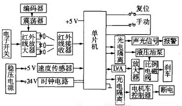 紅外線發射單元包括編碼調制器、載波振蕩器、電子開關、發射管、聚光透鏡等組成;紅外接收單元為紅外集成一體化接收頭;主控制單元由單片機、時鐘電路、復位電路、手動操作鍵盤、D/A轉換器組成;執行單元由光電隔離器、模擬放大器組成;聲光報警單元由電機車電笛和閃光報警電路構成;液壓制動單元由速度傳感器、液壓油泵、比例電磁閥、溢流閥、液壓油缸、剎車推桿等組成。