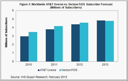 據(jù)IHS Screen Digest的研究報(bào)告,2011年第四季度美國(guó)電話電報(bào)公司(AT&T)的Uverse服務(wù)新增用戶數(shù)量,多于對(duì)手Verizon的FiOS服務(wù)。這是AT&T在競(jìng)爭(zhēng)激烈的付費(fèi)電視領(lǐng)域連續(xù)第10個(gè)季度戰(zhàn)勝Verizon。
