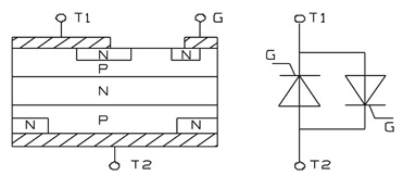 雙向可控硅可被認為是一對反并聯連接的普通可控硅的集成,工作原理與普通單向可控硅相同。圖1為雙向可控硅的基本結構及其等效電路,它有兩個主電極T1和T2,一個門極G,門極使器件在主電極的正反兩個方向均可觸發導通,所以雙向可控硅在第1和第3象限有對稱的伏安特性。雙向可控硅門極加正、負觸發脈沖都能使管子觸發導通,因此有四種觸發方式。