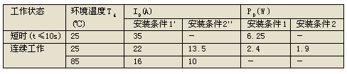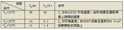 在DC/DC轉換器中,MOSFET工作在占空比變化的脈沖狀態,但也不是工作于窄脈沖狀態;工作溫度范圍是-40~85℃。表1、表2中無這種工作條件下的ID及PD值。ID可在下面的范圍內選?。?TA=70~85℃時的ID)
