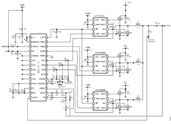 由控制器FAN5019B及3個驅動器FAN5009組成的三相同步整流降壓式DC/DC轉換器電路如圖7所示?,F使用條件:VIN=VCC=12V(VCC是供控制器及驅動器的工作電壓),VOUT=1.5V,IO=65A(IO即IOUT(max)),fsw=228kHz,選擇開關管及同步整流管(采用兩個并聯組成)。