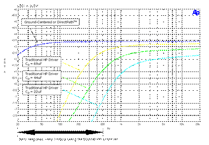 對于 100Hz 的截止頻率及 16Ω 的耳機(jī)喇叭阻抗,電容必須是 110μF。對于需要小體積尺寸的情況而言,這會造成電容值及實(shí)體尺寸過大,而且使得成本過高。許多工程人員只能改用 22μF 的較小電容,不過這會影響耳機(jī)的低頻率傳真度,而導(dǎo)致低音響應(yīng)不佳。