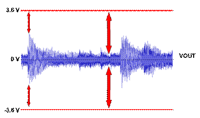 在 AB 類放大器的接地置中架構(gòu)做法中,放大器總是以最高電源電壓運(yùn)作,這表示,對于音頻的無噪聲階段而言,整個輸出 FET 的電壓降幅相當(dāng)大。以鋰離子電池為例,一般的電池電壓范圍是 3.0V 至 4.2V。假設(shè)電池供應(yīng) 3.6V 的電壓,圖 5 的紅色箭頭表示播放輸出音頻時整個輸出 FET 的電壓降幅。