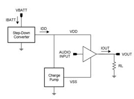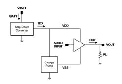 其中的技巧是設(shè)計(jì)將電池電壓降低至較低電壓的放大器,并使用適應(yīng)性電源軌 (分別有負(fù)電源軌) 降低播放音樂時整個輸出 FET 的電壓降幅。其中一種實(shí)現(xiàn)這類放大器的方式是,使用電荷泵作為圖 8 所示的步降區(qū)塊。某些工程人員偏好這類做法,原因在于步降電荷泵僅需要相對較小的飛馳電容(flying capacitor) (1μF 至 2.2μF),而這也是相對較小的組件