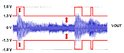G 類放大器一般使用多個電源電壓,以發(fā)揮比 AB 類放大器更高的效率。在本例中,TI 最新的 G 類 DirectPath 放大器 (TPA6140A2) 首先將電池電壓降低至較低的電壓值,然后切換至低信號強(qiáng)度的低供應(yīng)電壓 (1.3V),并且只有在信號強(qiáng)度超出該低電源電壓軌時,才切換至較高的電源電壓 (1.8V)。這些適應(yīng)性電源電壓軌的升降速度高于音頻,因此可避免失真或削波。此外,由于一般聆聽的音頻低于 200mVRMS,因此電源電壓通常是最低值 (亦即 1.3V),并且提供優(yōu)于上述 AB 類放大器的效率。在音頻的無噪聲階段期間,整個電源軌的電壓會降低,而且信號相當(dāng)小。當(dāng)音頻變得大聲時,放大器會切換至較高的電源軌,然后切換回較低的電源軌,導(dǎo)致整個輸出 FET 的電壓降幅縮小。圖 7 的紅色箭頭表示此電壓降幅。