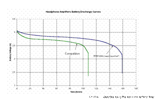 下圖的 Y 軸表示電池電壓,X 軸表示時間。綠線表示一般的接地置中耳機(jī)放大器,藍(lán)線表示 G 類耳機(jī)放大器。