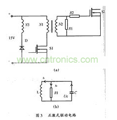 電路原理圖如圖3(a)所示,N3為去磁繞組,S2為所驅(qū)動(dòng)的功率管。R2為防止功率管柵極、源極端電壓振蕩的一個(gè)阻尼電阻。因變壓器漏感較小,且從速度方面考慮,一般R2較小,故在分析中忽略不計(jì)。其工作波形分為兩種情況,一種為去磁繞組導(dǎo)通的情況,見圖4(a);一種為去磁繞組不導(dǎo)通的情況,見圖4(b)。