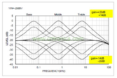 為了實現音效處理,有必要了解一下音頻DSP均衡器(EQ) 的作用。均衡器具有增益及濾波的電路,增益電路對聲音進行提升(Boost) 與削弱(Cut) ;濾波電路可以調節到需要的頻率響應。普通模擬音效處理IC一般可以提供2頻帶(Bass/Treble) 或者3頻帶(Bass/Middle/Treble),而數字音效處理IC可以提供多個頻帶,比如7頻帶,甚至更多。圖5是3頻帶EQ的曲線。